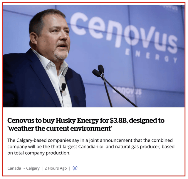 根据当时的协议,这笔价值约236亿加元的交易几乎不涉及大额现金流出。赫斯基的股东只需用手中的股票,按比例换取合并后新公司Cenovus的股份。